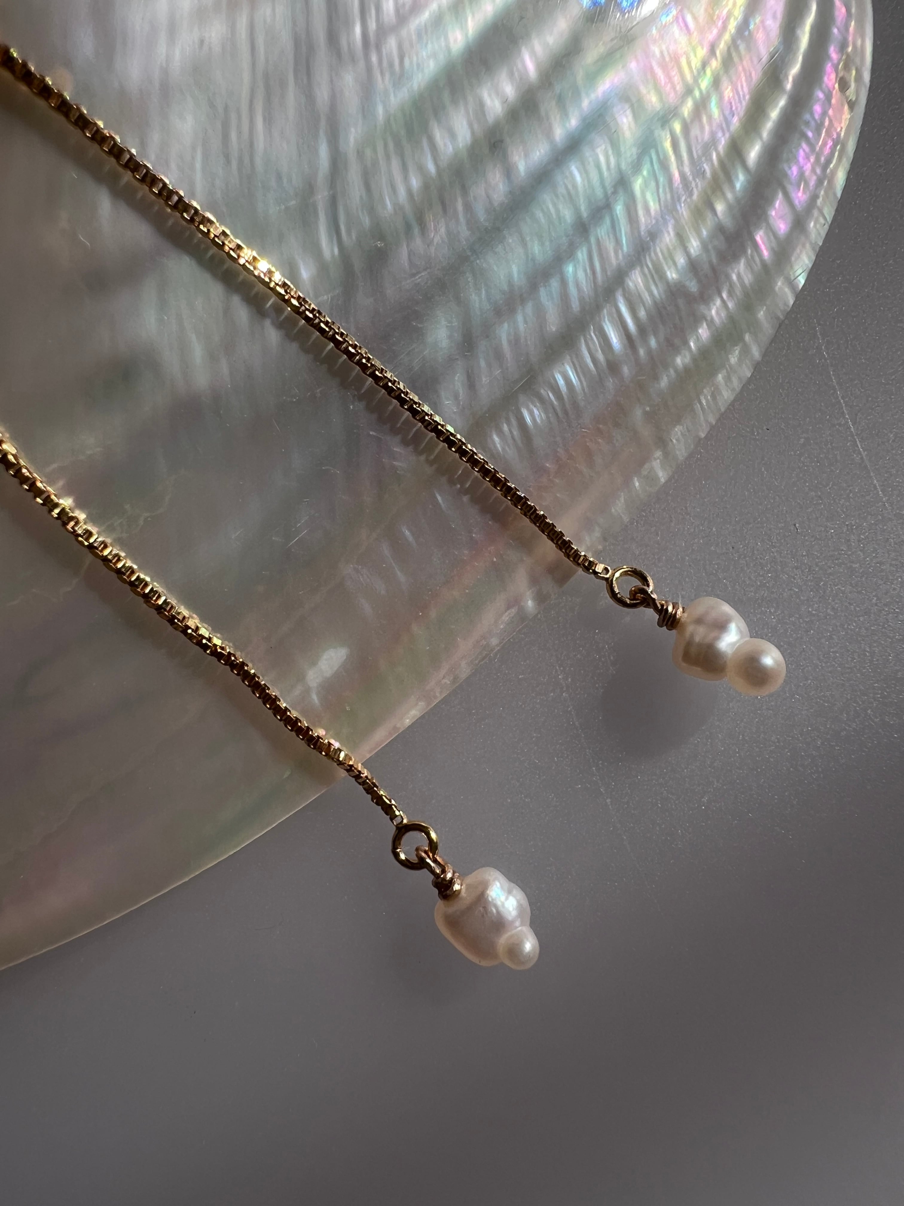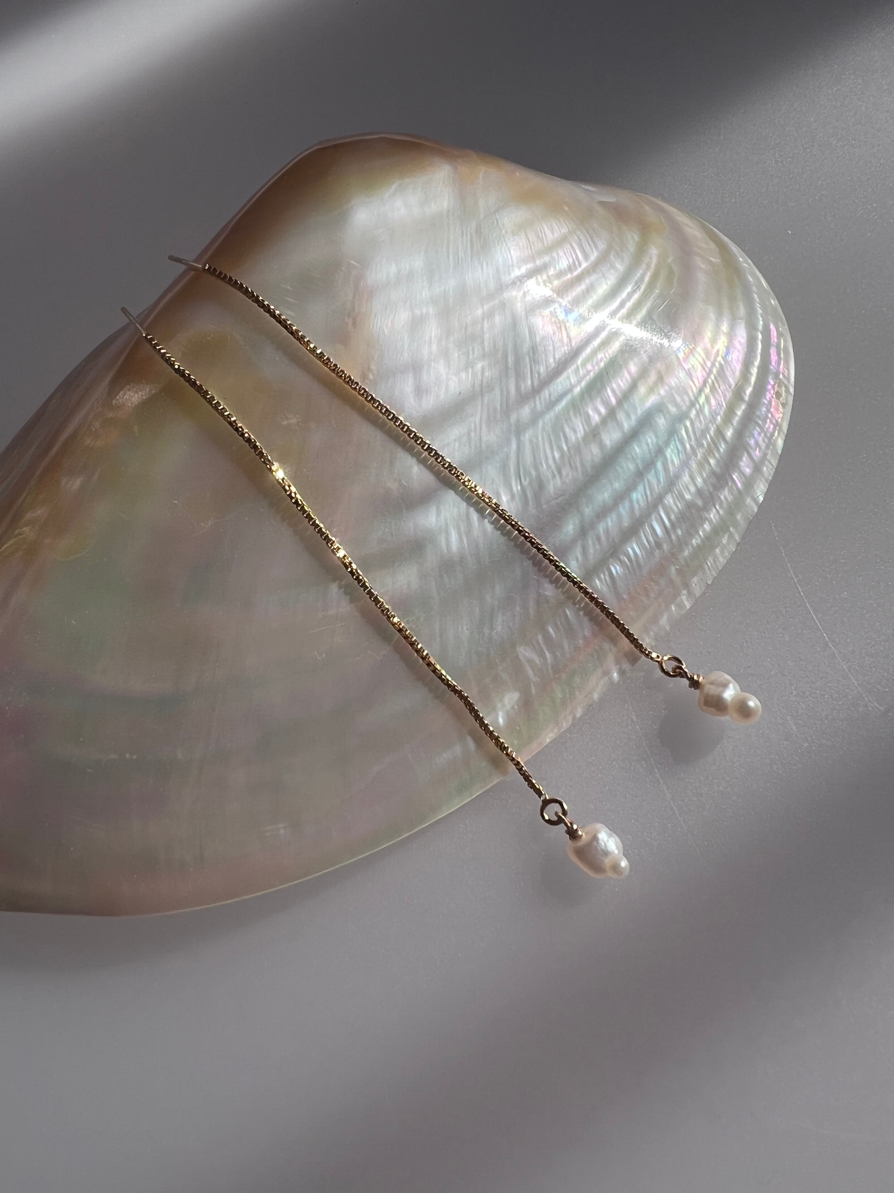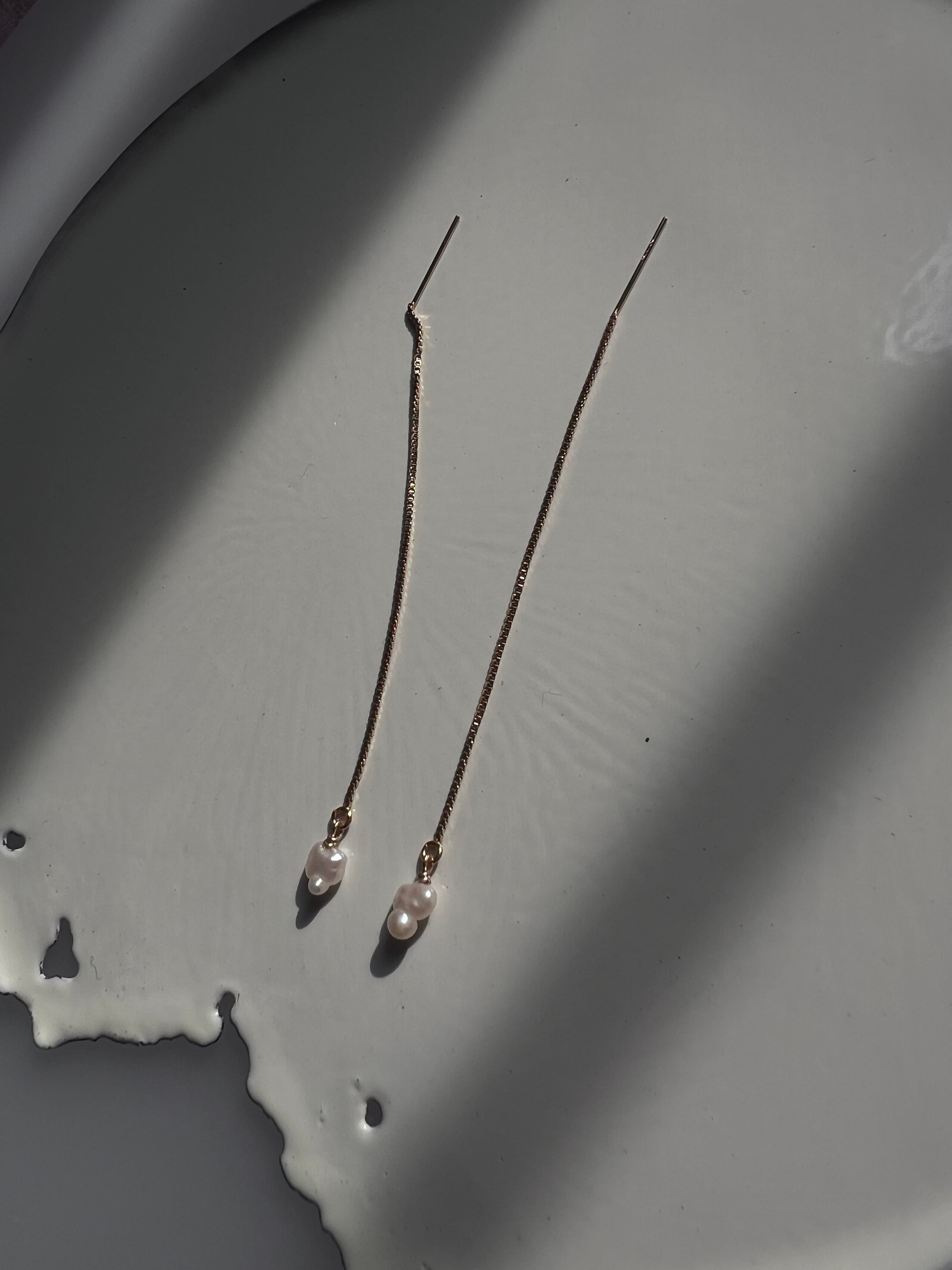 琵琶湖パールで作った長いチェーンが特徴のアメリカンタイプのピアスです。